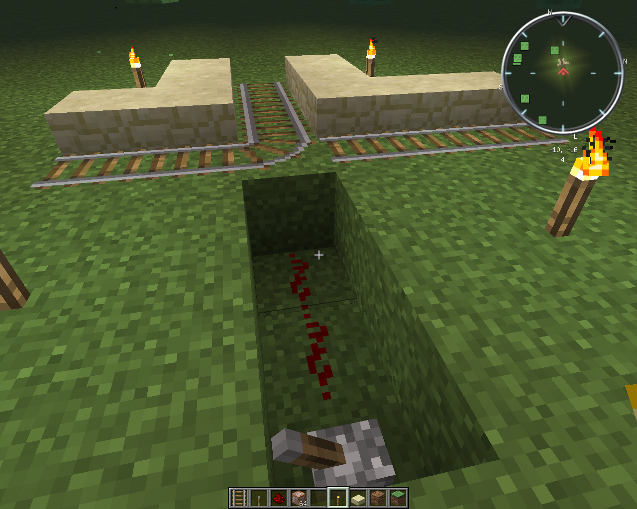Stejného přehazování výhybky dosáhneme také, pokud páčku od výhybky přesuneme někam, kde se nám to bude více hodit, pomocí redstoneového vedení. Příklad je na dalším obrázku, redstoneové vedení můžeme schovat pod zem nebo pod "nástupiště" vedle kolejí.