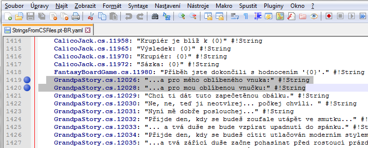 4.1. rozbalený soubor, který chceme editovat (v mém případě je to "StringsFromCSFiles.pt-BR.yaml") otevřeme v Notepadu++ (či jiném preferovaném editoru), najdeme co chceme, změníme a uložíme.