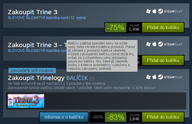 Trine 3 je v "klasické", 75% slevě. Ale protože už na Steamu vlastním Trine 1+2, nabídlo mi to další slevu, místo 5,49€ jen cenu 3,84€, pokud doplním svou kolekci všech Trine her. 45 kaček úspora.