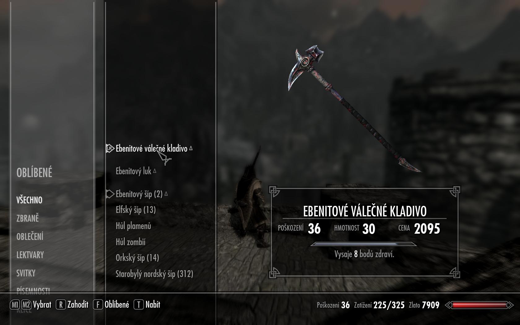 Zbraň -Ebonitová čepel,její očarování funguje neustále - saje životní energii z nepřátel a tudíž není potřeba ji dobíjet za pomocí kamenů duše.Mám ji chvilku,rychlá jak svina.Kladívko mám sice na 44,ale tenhle mazel tak pětkrát sekne za stejnej čas,co jeden uder ebonitovým kladivem.