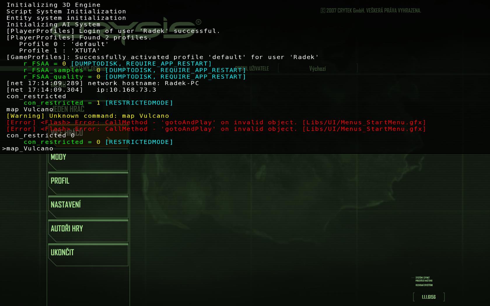 Zkoušel jsem i postup---Otevři adresář Electronic Arts\Crytek\Crysis\Game\Levels a zkopíruj celý adresář s modem do Game/Levels(popřípadě zálohuj soubory). Spusti Crysis, otevři konzoli a zadej příkaz "con_restricted 0"(bez úvozovek), potvrd.