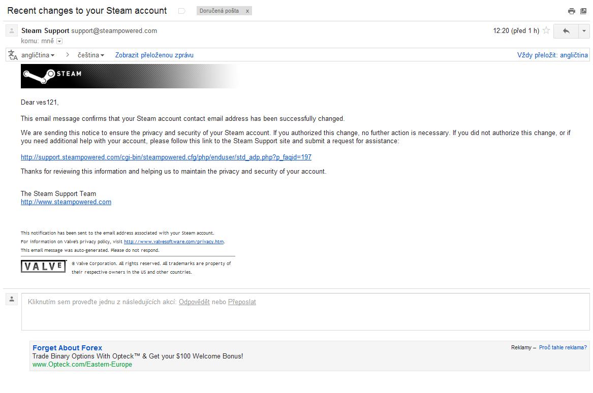 Dobrý den,dnes jsem přišel na email,měl jsem tam jeden nový mail(Více v popisu)Bylo tam napsáno"Váš email byl uspěšně změněn...."Zkoušel jsem se přihlásit,heslo nešlo...Všechny hry na steam jsem si kupoval elektronicky,co dělat?? :( Je nějaká možnost vrátit učet zpět??Děkuji...