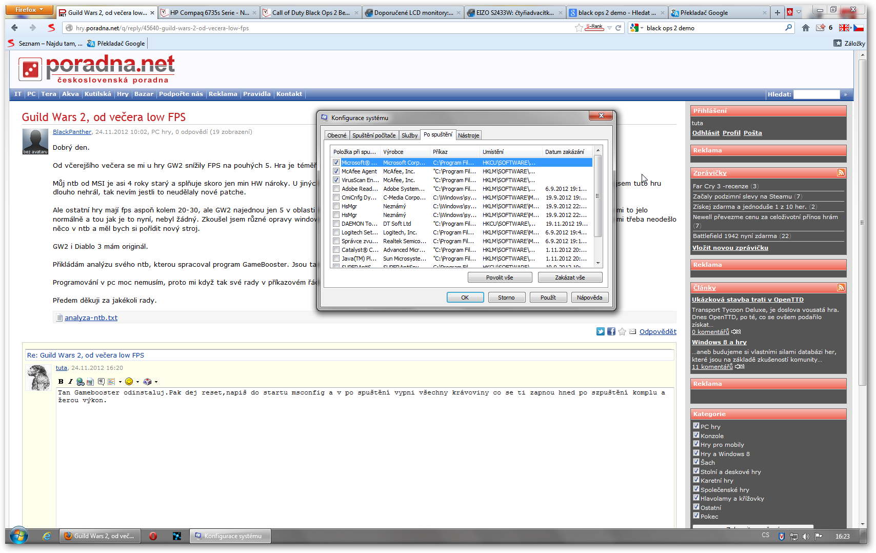 Ten Gamebooster odinstaluj.Pak dej reset,napiš do startu msconfig a v po spuštění vypni všechny krávoviny co se ti zapnou hned po spuštění komplu a žerou výkon.