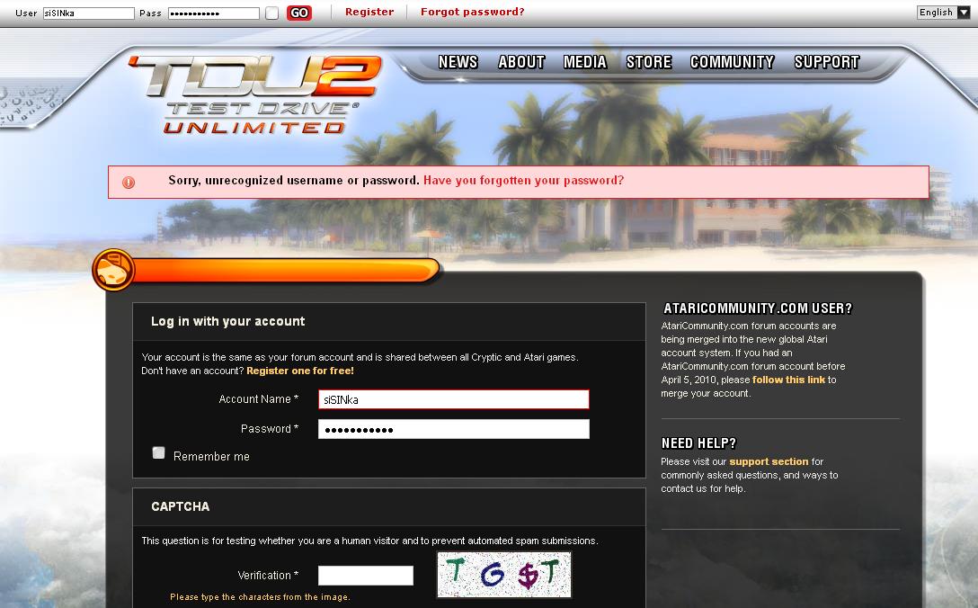 Po delší době jsem si chtěl zajezdit, ale nedá se připojit online. Že prý špatné heslo, nemůže být ověřeno na www.tdu2.com. Heslo je 100% dobře. Problém s logováním do hry má více lidí (steamforum). Fungují jen offline profily.