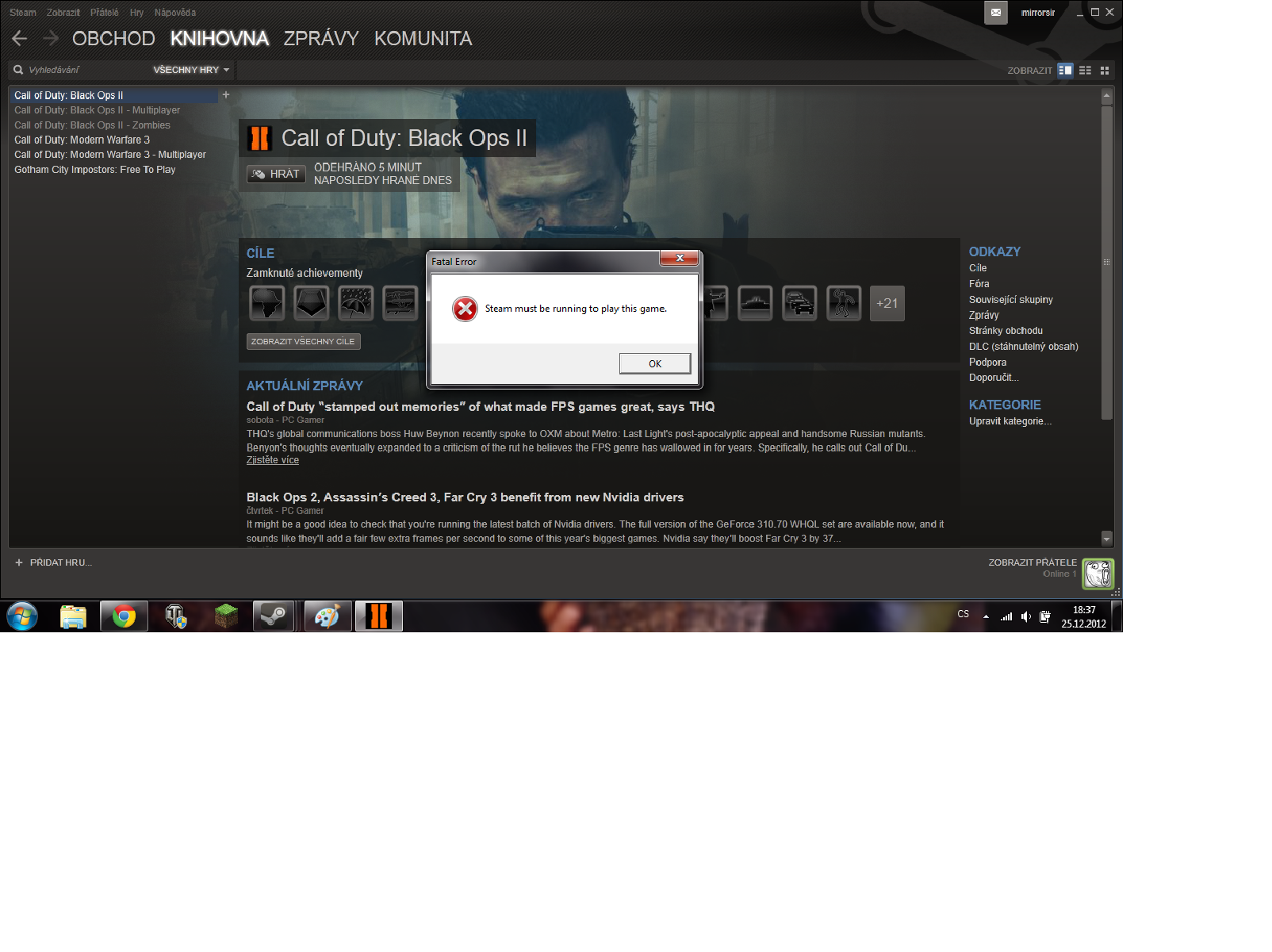 Zdravím, potřeboval bych poradit ohledně Call of duty: Black ops 2. Hra mi nejde spustit a furt to háže tu stejnou chybu "Steam must be running to play this game". Zkoušel jsem už miliony metod jak to opravit ale furt nic! Nevím jestli je chyba u mého počítače nebo na Steamu, jelikož vlastním i Modern warfare 2,3 a i Black ops 1 a s tím jsem nikdy žádné problémy neměl! Přihodím jsem i obrázek. Každopádně díky za odpověď!
