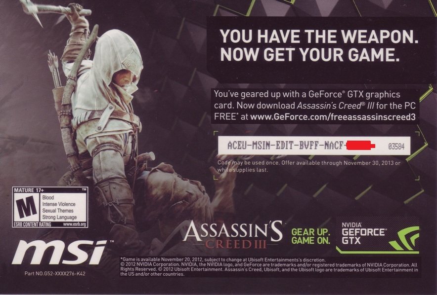 Koupil jsme si grafickou kartu 650 Ti ke která sjem měl kod na assasina 3. Problem byl ten že mi to nešlo a stale njede stáhnout píše to neplatný kod.
