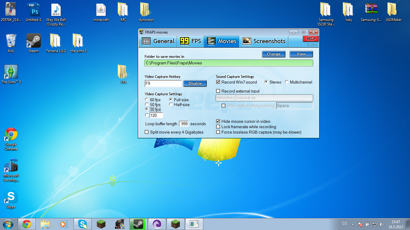 Mám problem.Když hraju MC tak jedu na 70-150 fps.Když ale zapnu nahrávaní pomocí frapsu,fps mi klesna na max.30.Nastavení mám v pořádku,když natáčím jiné hry tak jedou v poho.