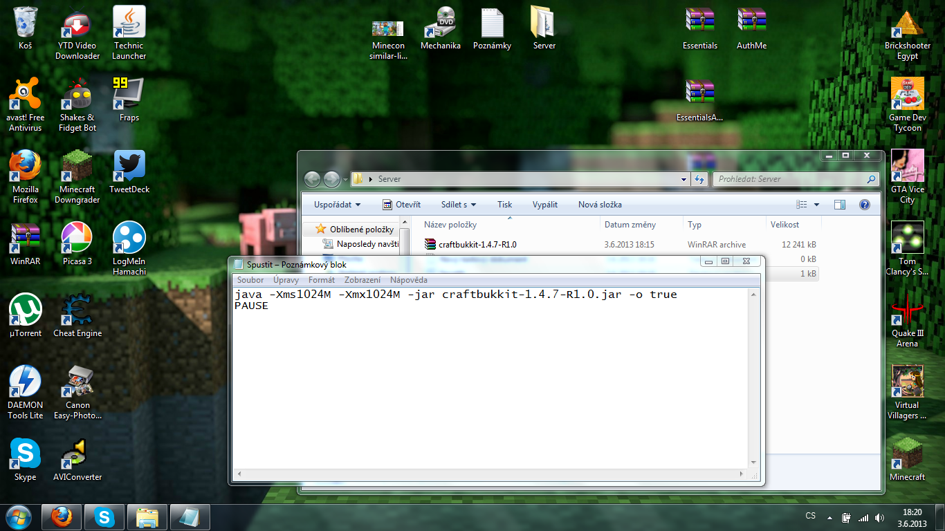 Čau lidi,mám problém.Když jsem si s Martinmachem11 (kámoš) chěl zahrát Minecraft na serveru který běží přez Hamachi,tak mi to vyhodilo chybu.Použil bych .exe,ale na tom neběží pluginy.Už kdysy jsem dělal minecraft servery přez hamachi,které vklidu jeli i s pluginama,ale najednou to prostě nejde.Nevím,v čem je chyba,dělal jsem to jako vždy za pomoci artiklu na oficiální bukkit wiki,ale nic.Mám verzi Javy 7 update 21,bohužel nevím kolikatibitovou.Zbytek pochopíte z obrázku.Může mít teda někdo helfnout?