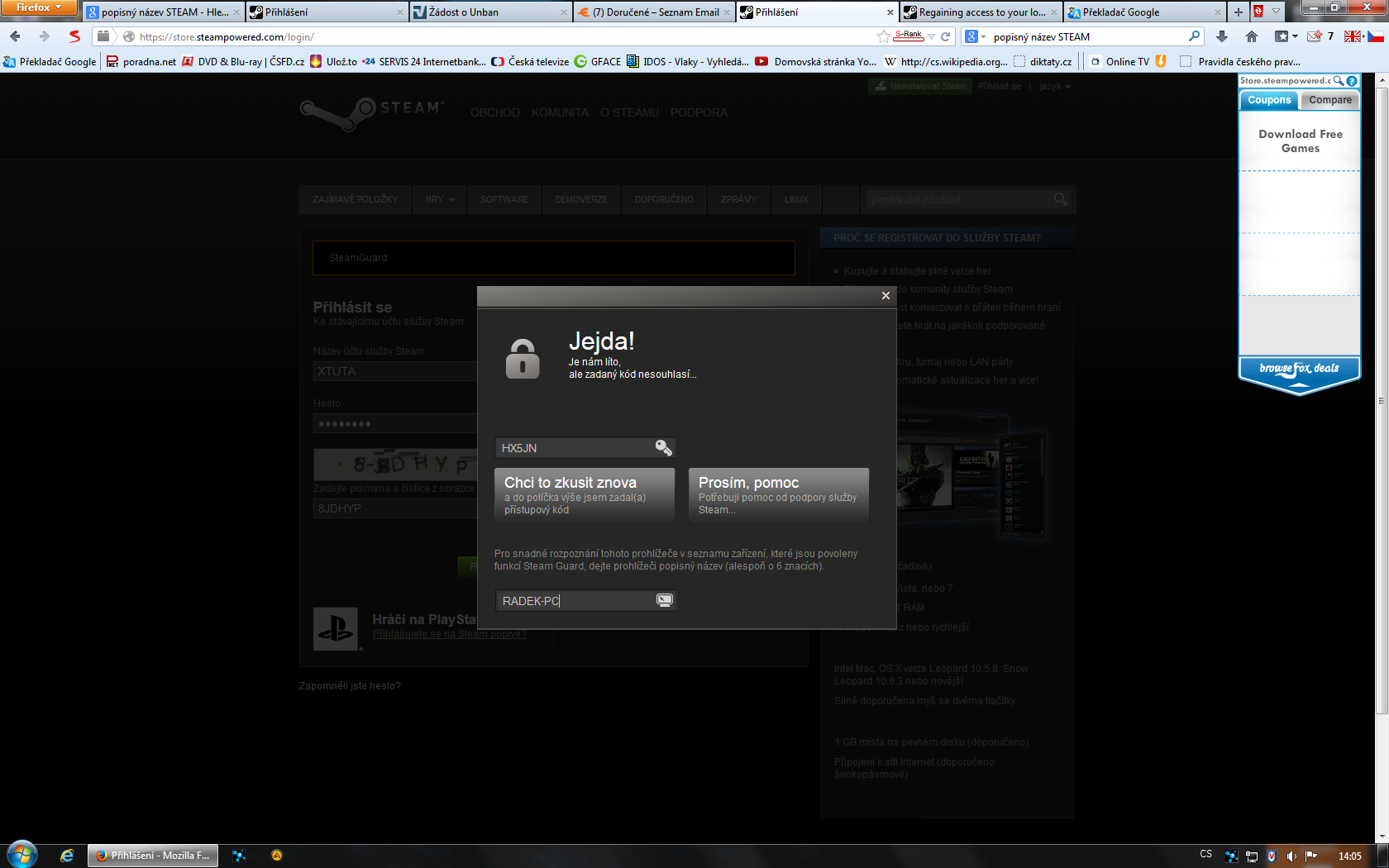 Zdravím,měl sem ten samý problém ale jen z toho důuvodu,že jsem se přihlašoval ne ve steamu ale v prohlížeči mozzila na stránkách steamu.Do políčka sem zadal Mozzila a samozřejmě ten kód co mi přišel na email a vše frčí.Chce to asi název prohlížeče ve kterém se momentálně připojujete.