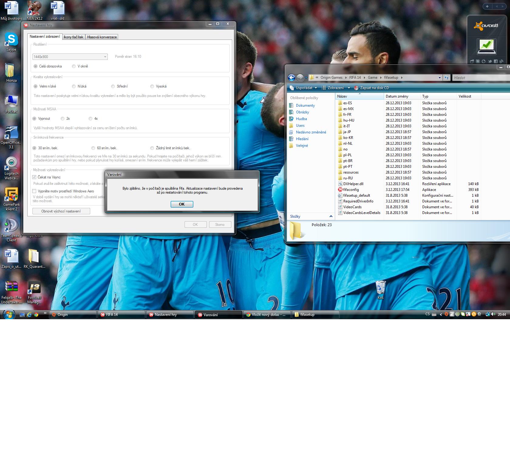 Popis problému: Po koupi FIFY mi hra běžela 3 měsíce bez problémů, jen když jsem šel na plochu, tak jsem se nemohl zpět vrátit do hry, objevil se jen šedý obdélník skoro přes celý monitor a FIFA si jakoby myslela, že v té hře jsem, jen jsem neměl obraz, zvuk jsem slyšel. Hra už pak šla vypnout pouze ALT+F4. Teď nejde spustit vůbec, PC si myslí, že je hra spuštěná, protože když jsem jí chtěl odinstalovat, tak mi to napsalo, že je spuštěná. Nebo když jsem chtěl změnit rozlišení, také mi to napsalo, že je hra spuštěná, viz obrázek. Prosím o nějakou radu, jsem na fifě závislý a nevím, co bych dělal, kdyby mi nešla. :-) Děkuji trywii
