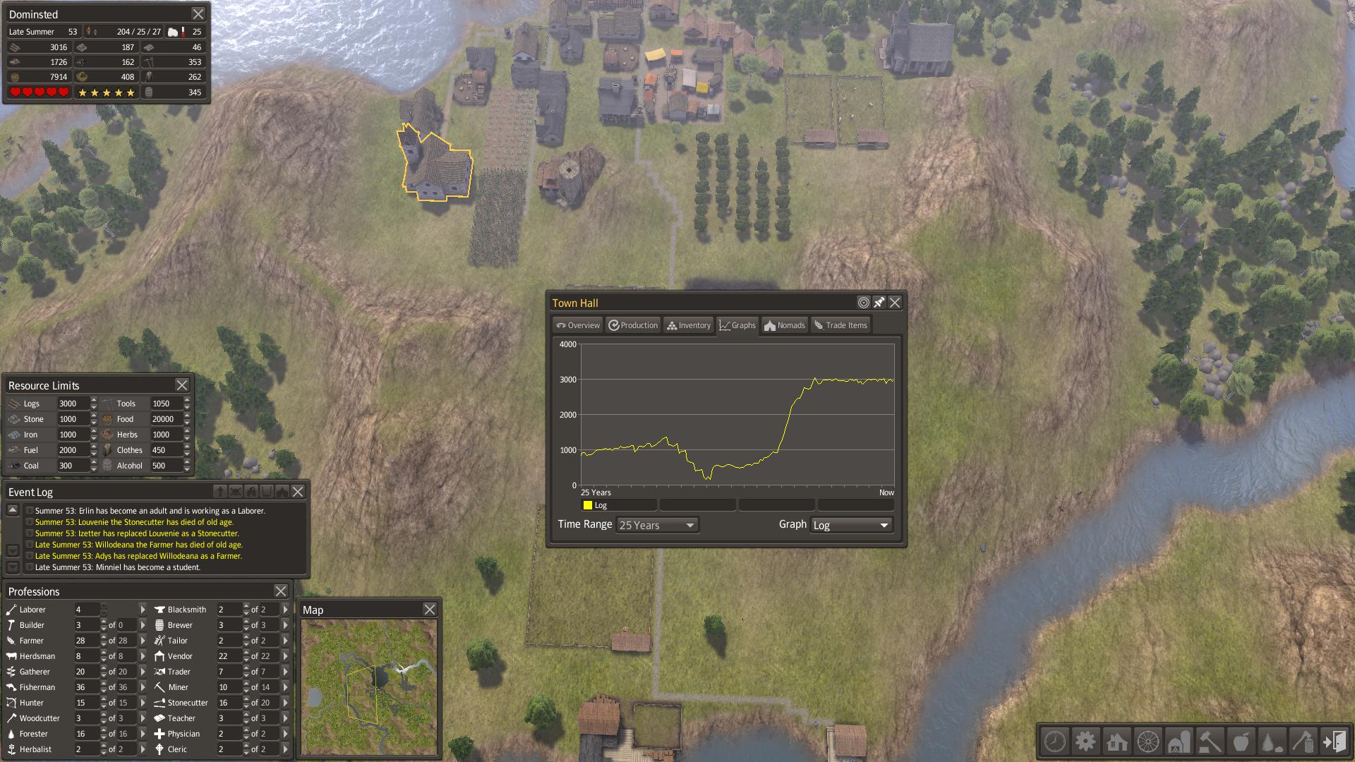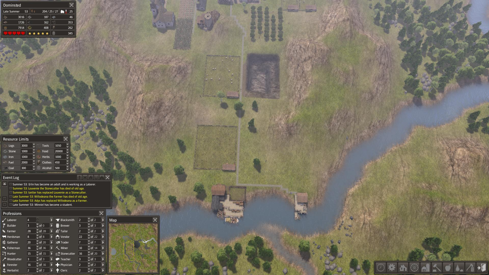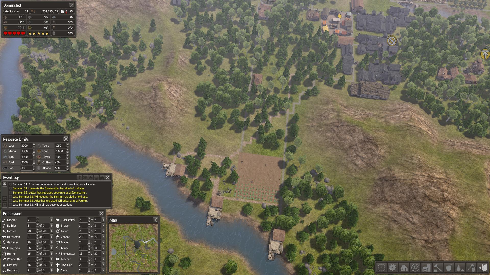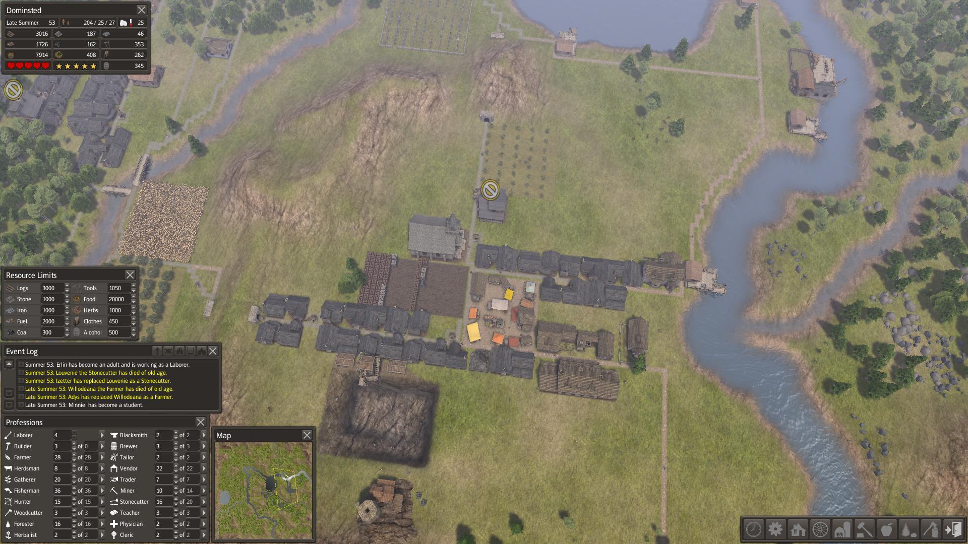 Jojo hraju. Rok 44, 150 lidí... začalo mě to nudit tak jsem si navrhl nové město na to bylo potřeba 200 bulderů a zkoušim jestli mi to vyjde. Zatim se docela daří sice moje zásoby klesají ale zatím to jde až na to že mi dochází veškeré dřevo i forewood. xD Ale jinak stále umírají jen na old age takže v pohodě. xD
