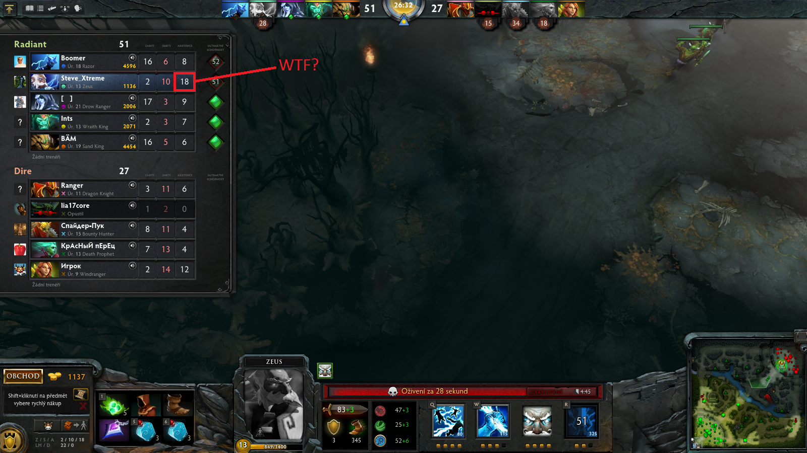 Tak už to nemusíme řešit - umím to dost dobře za Bounty Huntera. Minulej zápas jsem měl 10 killů, 13 asistencí a 2 úmrtí. Boží :D Problém byl že když se nám půlka teamu odpojila tak se to už s Tidehunterem a Death Prophetkou nepodařilo odrazit. Prohráli jsme - ale aspoň pro mě to stálo za to :)