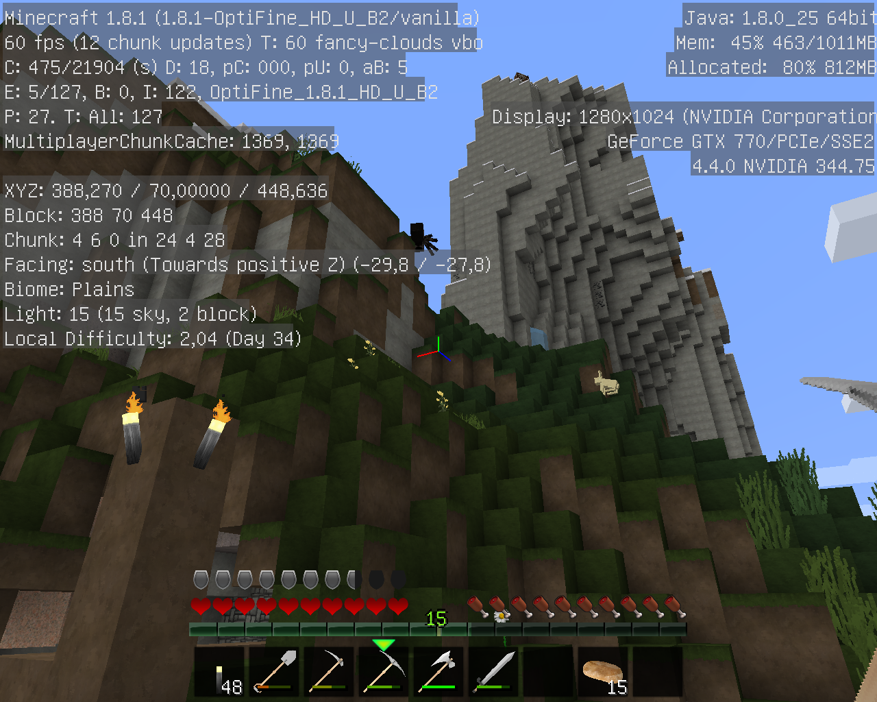 Minecraft 1.8.1 + OptiFine_HD 1.8.1. Vše, kromě dohlednosti, nastaveno na max. (OptiFine umožňuje jít nad možnosti vanilla hry, dohlednost mám momentálně na "20" z 32). K tomu vlastní balík textur (slepenec z více zdrojů, abych měl nově otexturováno úplně všechno, bohužel kvůli autorským právům výrobců texturepacků je to nezveřejnitelné) v rozlišení minimálně 128*128 pixelů na kostku & kompletně nové předměty, ikony. Zbývá mi pořešit potfory, podklady už mám.