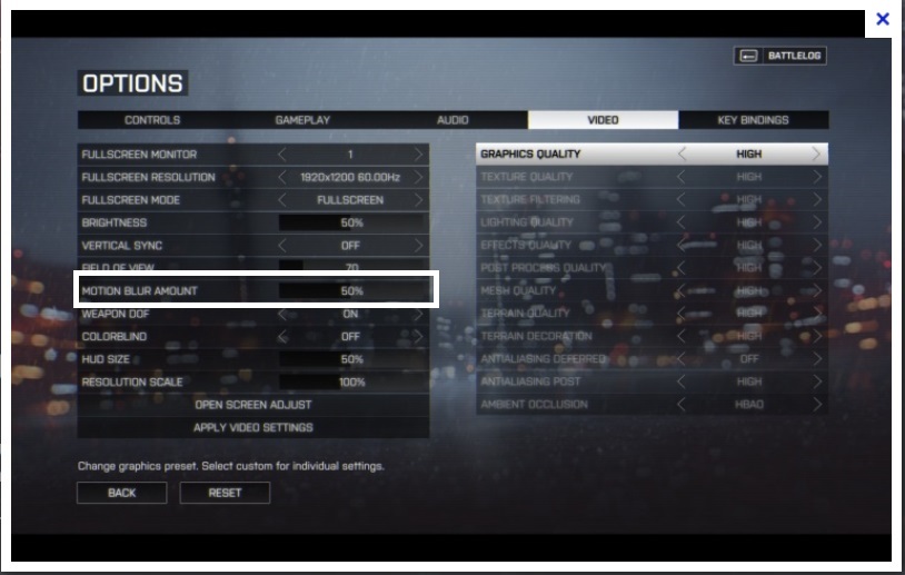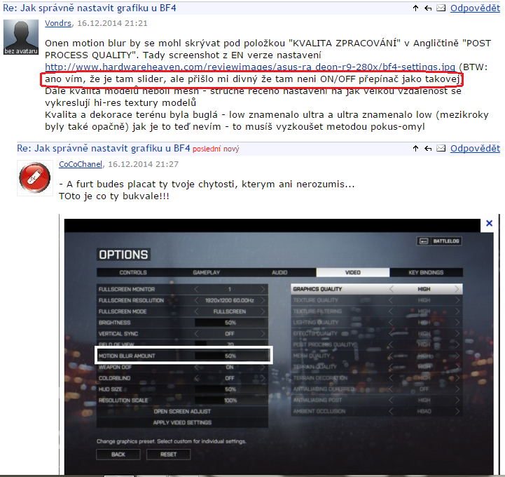 Onen motion blur by se mohl skrývat pod položkou "KVALITA ZPRACOVÁNÍ" v Angličtině "POST PROCESS QUALITY". Tady screenshot z EN verze nastavení http://www.hardwareheaven.com/reviewimages/asus-ra deon-r9-280x/bf4-settings.jpg (BTW: ano vím, že je tam slider, ale přišlo mi divný že tam neni ON/OFF přepínač jako takovej)