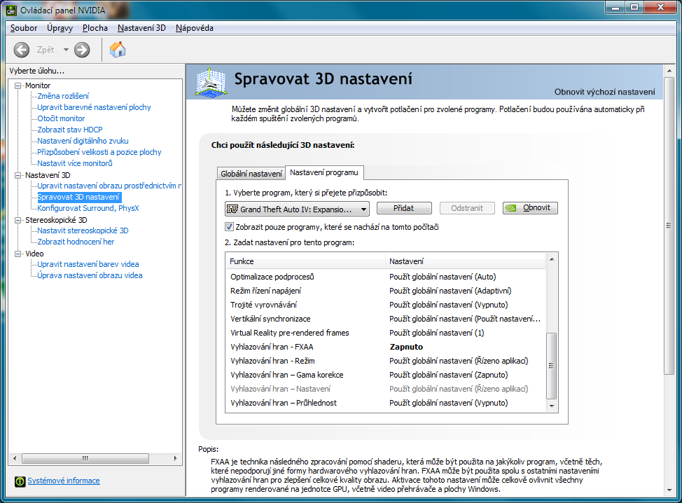 Zdravím, nainstaloval jsem si GTA 4, celkem to šlape, hraju více-méně na high,ale nemůžu nikde nastavit anti-alising. Nainstaloval jsem všechny patche, ale na netu jsem se dočet,že pc verze snad ani AA nepodporuje. Jenže já hrál kdysi gta u kamaráda a rozhodně bych si těch nevyhlazených hran všiml. A na YT jsou taky záběry z PC a vypadá to krásně, tak já už nevim. Nějaké rady?