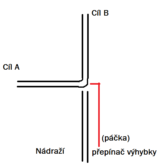 Problém nastává, když se z B chci vrátit na nádraží. Výhybka je nastavena ve směru na A, jak ji přepnout?