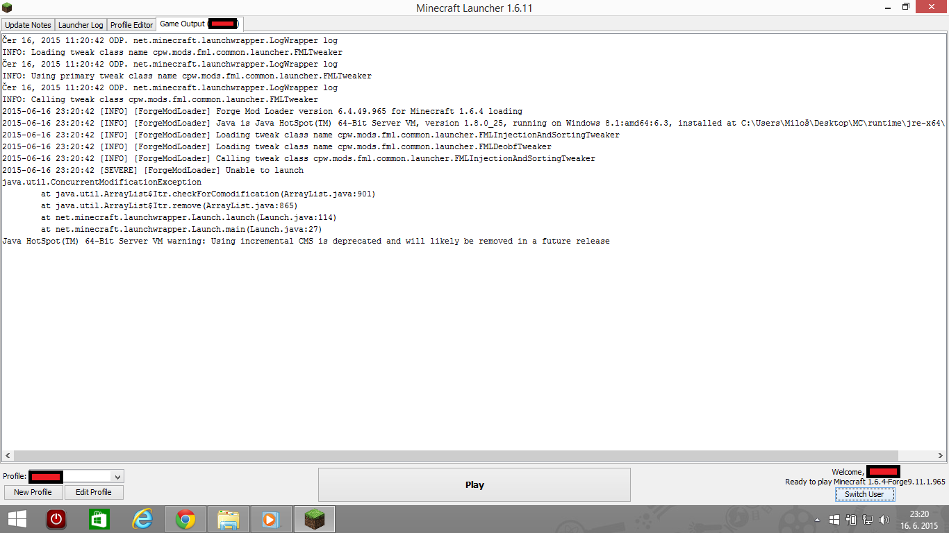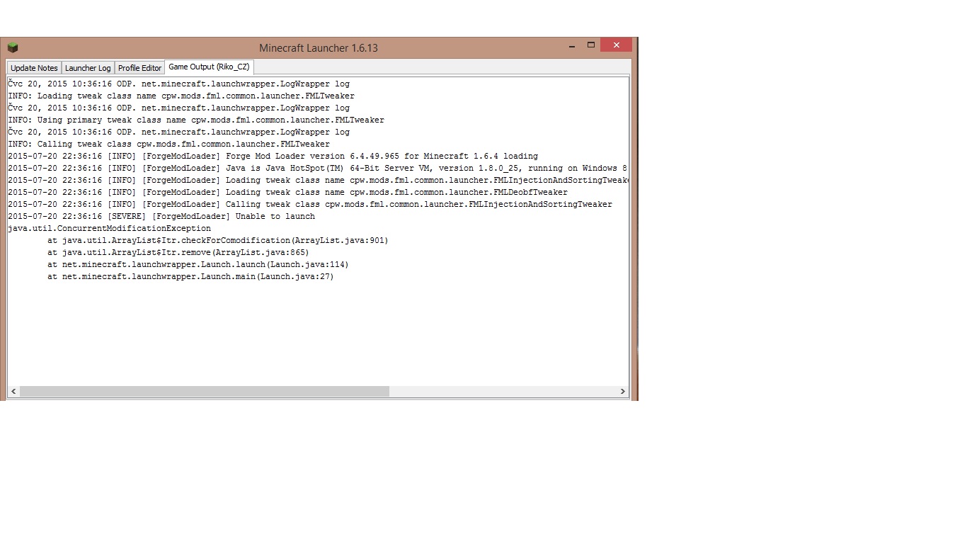 Forge mám nejnovější na 1.6.4 , javu mám teda Java 8 update 51 + JavaFX 2.1.1 , launcher 1.6.13. a m…