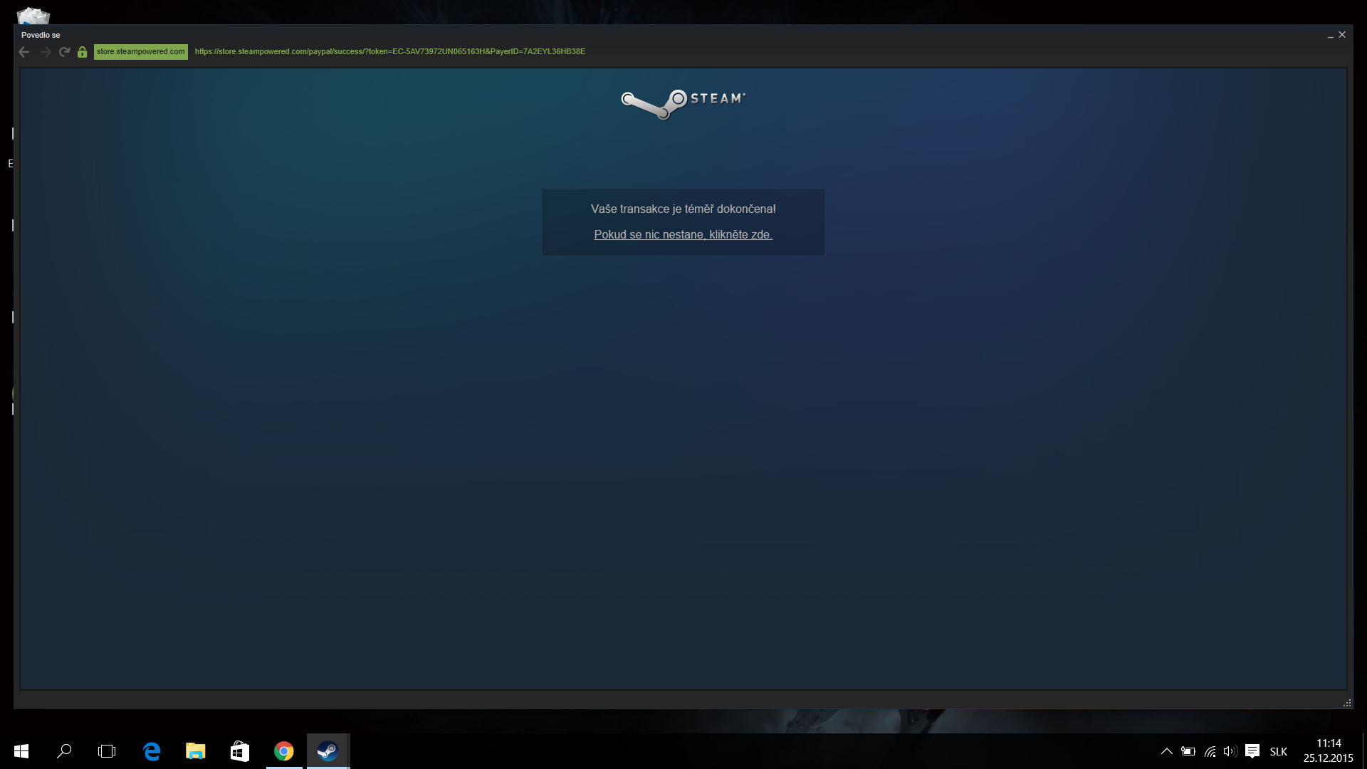 ahoj, kamarát ma presvedčil na kúpu CS-GO keď sú tie vianočné zľavy ale mam problém.. prvý krát si kupujem niečo cez steam a keď som zaplatil cez paypal tak mi to vypísalo Vaše transakce je téměř dokončena!