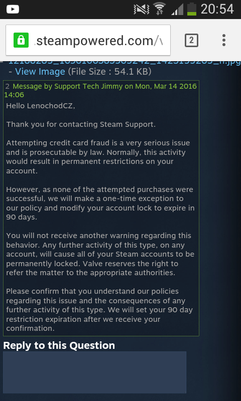 Dobrý den potřeboval bych pomoct se steamem mam ho zamknutej ale normálně jsem se přihlásil a hry hrát můžu ale koupit si přes paysafecard hry nemůžu a do Counter-Strike Global Offensive přes tržiště butterfly | Safari Mesh si koupit též nemůžu a když jsem psal na support tak po 2 dnech mi přišlo že mi odemknou účet po 90 dnech jak mile jim pošlu že tomu rozumim ale nevim kam jim to mam poslat protože mi to tam nenapsali. Byl bych moc rád kdyby jste mi napsali kam to mam napsat. Děkuji