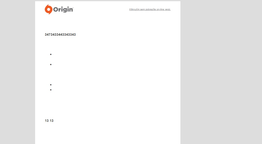 Včera si brácha koupil SW:Battlefront v kamenném obchodě JRC přijel domů a hru okamžitě šel zkusit samozřejmě prvně musel vytvořit Origin účet kam ovšem zadal své pravé údaje (myšleno hlavně datum narození) ovšem Origin má takzvané "dětské účty" a tak se mu vytvořil jeden takový ovšem následně hru nainstaloval a chtěl jít hrát, zde se nachází náš problém, Origin blokuje dětskou aktivitu pokud o ní neví rodiče tak na email přišel mail s předmětem "Upozornění rodiče na vytvoření omezeného účtu Origin" který obsahoval dvě čísla a čtyři tečky viz. příloha. Vyzkoušel jsem fakt všechno ale v emailu se nedá najít žádný ověřovací odkaz ani nic podobného a mail dostávám furt stejný žádná změna ani když jsem si ho nechal přeposlat asi po 5. Ještě chci poprosit aby jste se vyhnuli odpovědím typu "když je děcko nemá hrát hry" apod. Vzpomeňme si jak jsme byly děcka a taky jsme kalili všecko co šlo :D