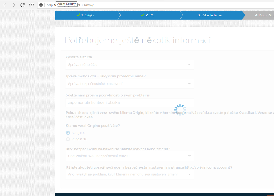 chtěl jsem se zeptat, jestli máte zkušenosti s originem a obnovováním kontrolní otázky. teď mám takový problém, že chci změnit email a chce to po mě kontrolní otázku, kterou jsem zapomněl. zkoušel jsem všechno, pak jsem chtěl napsat na EA help, vyplnil ten formulář, co tam je ale stále se mi to načítá, už asi půl hodiny viz. obrázek. nevíte co s tím?