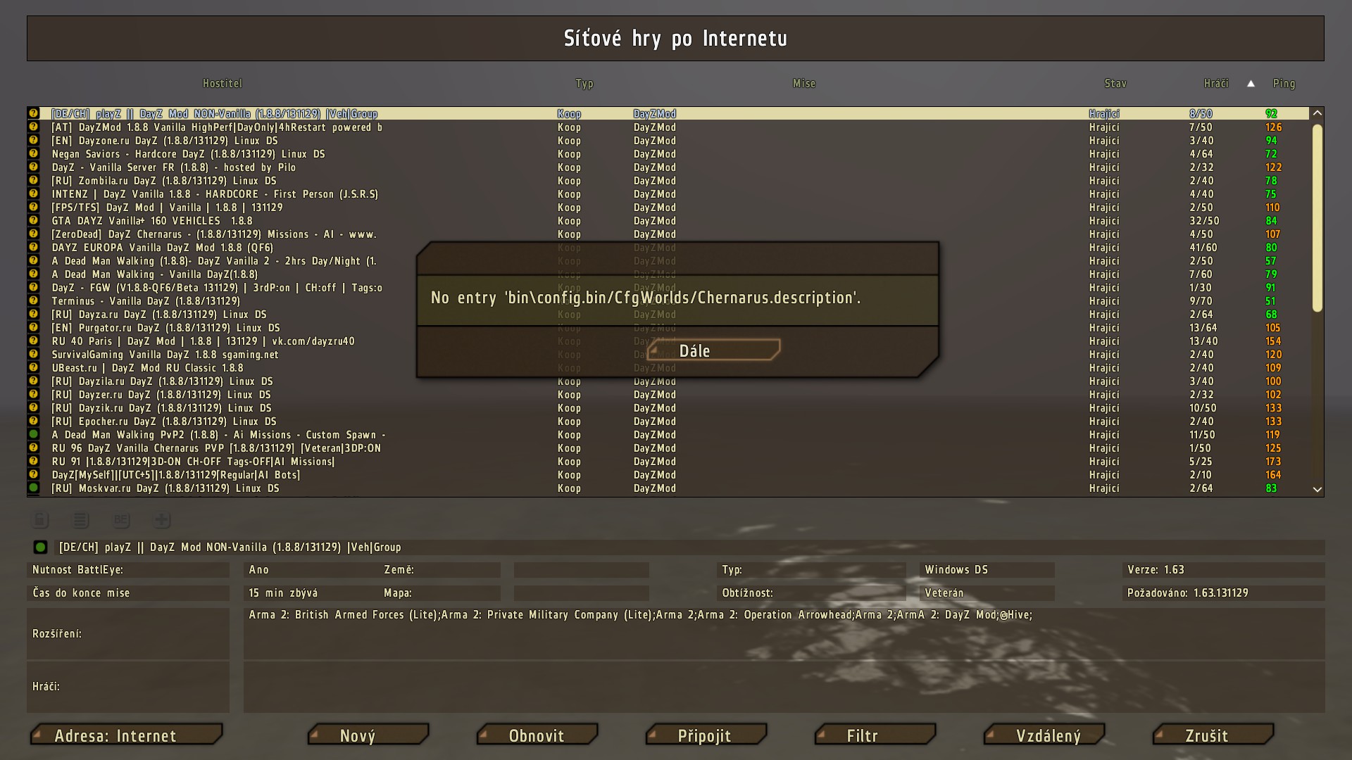 Jen na ten konkrétní server, nebo to dělá u všech? DayZ mod znám jen z doslechu, ale s Armou nějaké zkušenosti mám. Takže spíš jen obecně. Ta chyba znamená, že Arma 2 OA postrádá obsah z Army 2. Ověř si, v hlavním menu hry, že se ti načítá veškerý potřebný obsah (BAM, PMC, Arma 2). Módy se u army dají spravovat několika způsoby. Nepíšeš jak to řešíš ty, jestli natvrdo ve složce Addons, nebo separátně to taháš z jiné složky pomocí parametru. Nebo taky nějaký 3rd party launcher. Každopádně to může být i chybějící, nebo špatně umístěný mód (často ve složce Arma 2, místo Arma 2 OA,..).