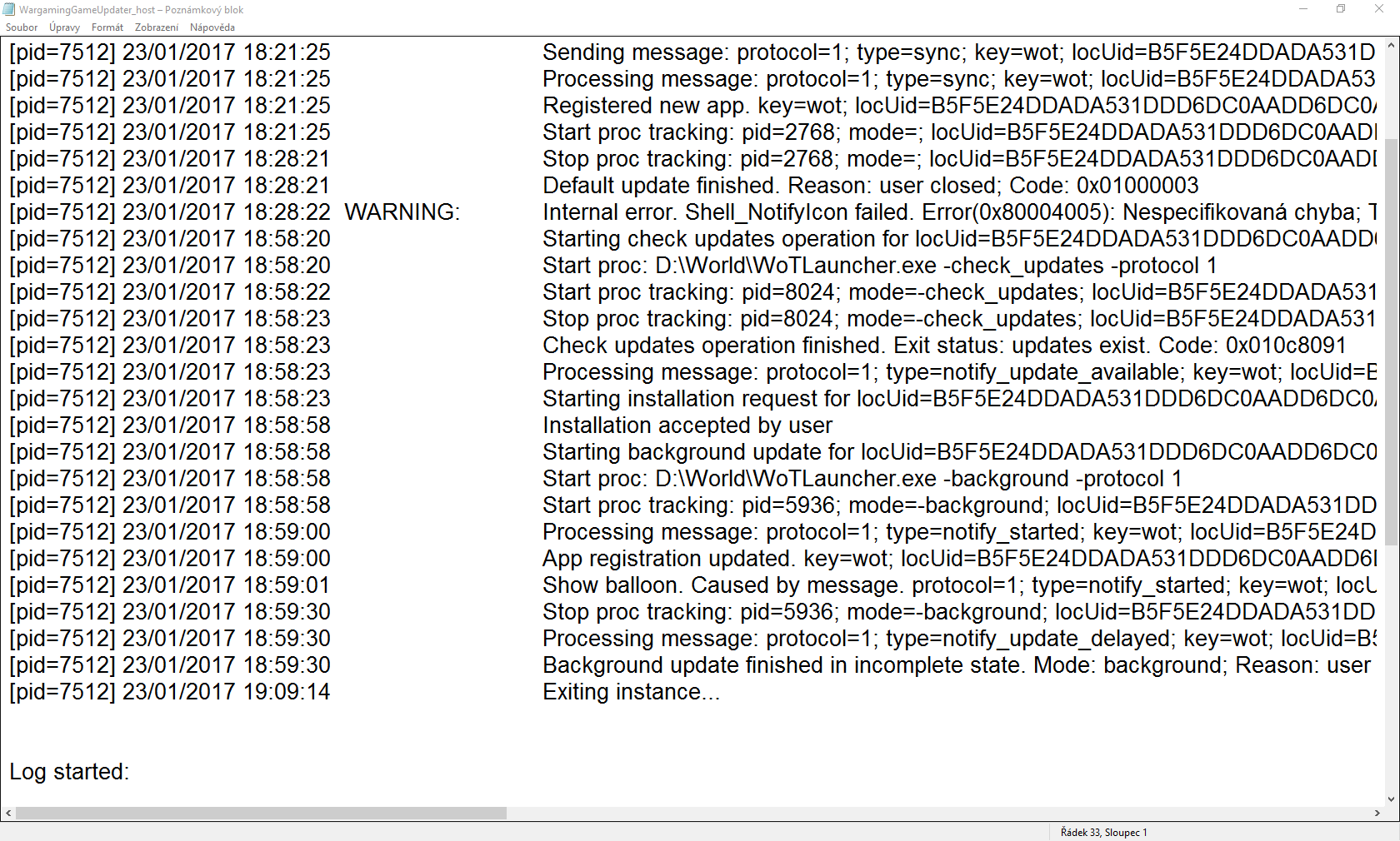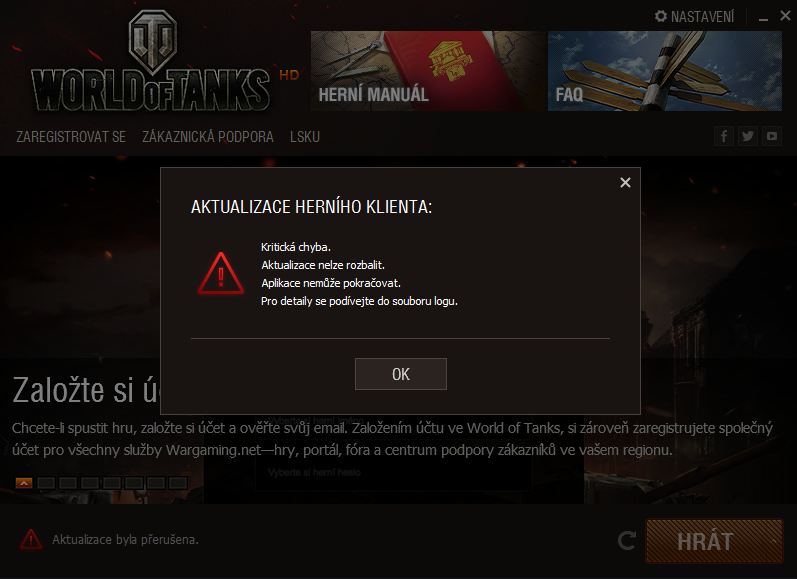 Ahoj mám problém se spuštěním hry world of tanks. Pokaždé mi to ohlásí chybu:(obrázek) Kritická chyba. Aktualizace nelze rozbalit. Aplikace nemůže pokračovat. Pro detaily se podívejte do souboru logu. Když jsem se podíval do souboru logu našel jsem tam jeden error v textovém dokumentu WargamingGameUpdater_host: error:[pid=7512] 23/01/2017 18:28:22 WARNING: Internal error. Shell_NotifyIcon failed. Error(0x80004005): Nespecifikovaná chyba; Trace: cmd=DELETE(2); cbSize=956; uVersion=4; uFlags=137; hIcon=00000000; hBalloonIcon=00000000; dwState=0; dwStateMask=1; dwInfoFlags=0(obrázek)