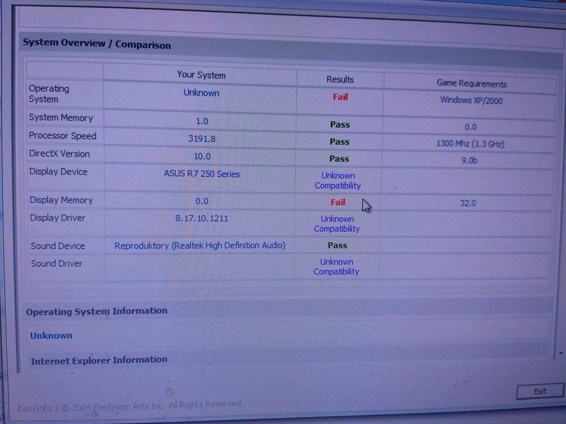 Dobrý den, chtěl jsem si po dlouhé době zahrát The lord of the rings the battle for middle earth ale pri spuštění ihned neodpovídá. Je to origo hra. Dal jsem ať to zkontroluje kompabilitu, to žeto ukázalo že to není kompatibilní na win7 je jasné, ale zkoušel jsem dávat spustit v win 2000,xp a pod. a ukázalo to že to nemá memory kompabilitu nevíte co stím ? foto sem dám.