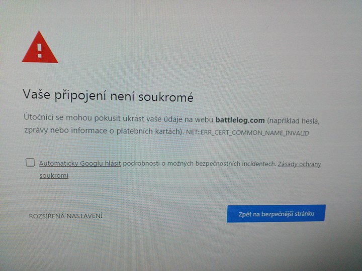 Zdravím vás, moc bych potřeboval pomoc ohledně Battlefield 4. Hra je koupena a nainstalovaná na Originu, ale když chci hru zapnout naskočí chrome a hlásí ,,Vaše připojení není soukromé" a dál nic, nevím co si o tom mám myslet. Dále to píše ,,Útočníci se mohou pokusit ukrást vaše údaje na webu battlelog.com (například hesla, zprávy nebo informace o platebních kartách). NET::ERR_CERT_COMMON_NAME_INVALID". Zkusil jsem najet na stránku Battlelog.com, tam jsem se příhlásil, ale nabízí mi to jenom koupi hry. Stalo se vám to taky ? A jak jste to řešili ? Byl bych rád za jakékoliv odpovědi. Děkuji.