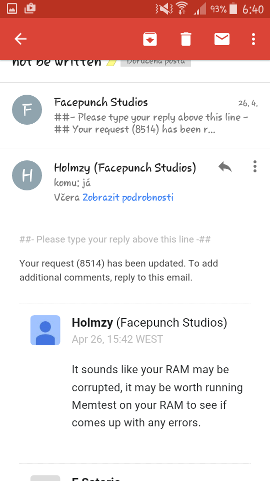 To samozřejmě chápu , ale když jsem se obrátil na vývojáře tak odpověď zněla že problém je v RAM. Udělal jsem Memtest a vše OK, přeinstaloval jsem znovu OS a pořád stejný problém, dokonce jsem zkusil i stáhnou pirátskou kopii OS a stále bez výsledku. Tak si říkám že problém bude někde v HW ale zase na druhou stranu vše ostatní šlape jak má ... tento problém má na celém světě asi 15 lidí takže si myslím že hru můžu taky asi vyloučit ...