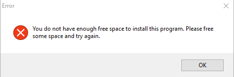Ovšem puštění souboru 1.0 zahlásí chybu nedostatek místa (obrázek 2), přestože jsem měl 20GB free.