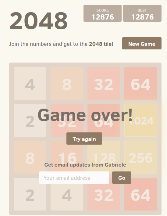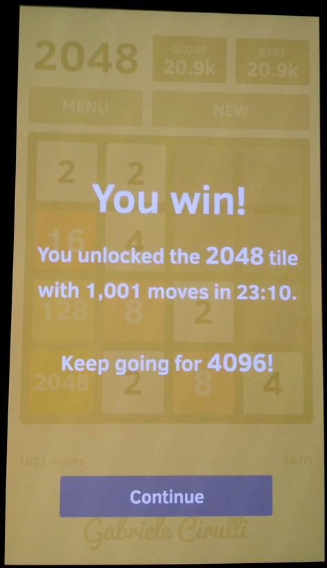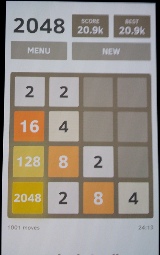 Existuji dve verze, prvni ktera konci 2048, to jsem udelal v pohode bez chyby. Druha verze je tzv. nekonecny mod, ktery je omezenen pouze moznym poctem tahu hry. Nejvice je mozne udelat asi 3.900.000 bodu. Dokoncil jsem tento mod do konce, ale pouze v te hre, kdy jsem po kazdem tahu mohl udelat jeden krok zpet.