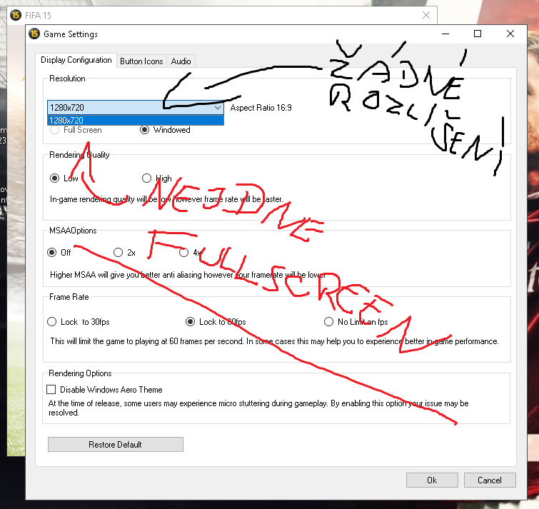 Zdravím, včera jsem si koupil FIFU 15. Hra se v pořádku nainstalovala, jak se doinstalovala pustil jsem game launcher a chtěl jsem si nastavit rozlišení atd. jenže když chci vybrat rozlišení tak tam žádné není je tam jenom 1280x720, nejde ani dát fullscreen viz. obr.