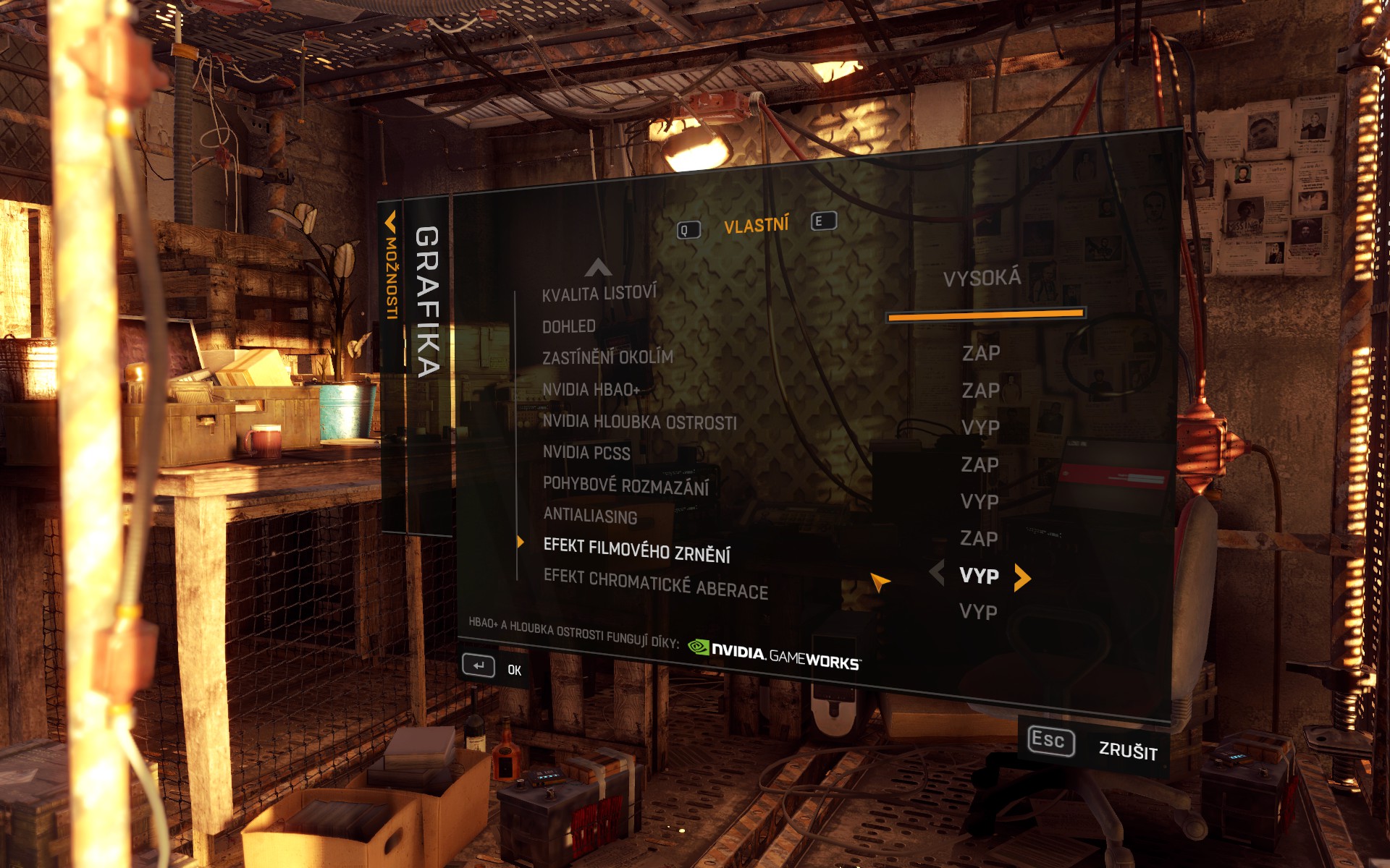 film grain - moc nemusím a vypínám (třeba v Battlefield či Star Wars Battlefront) asi aby hra vypadala víc filmově...