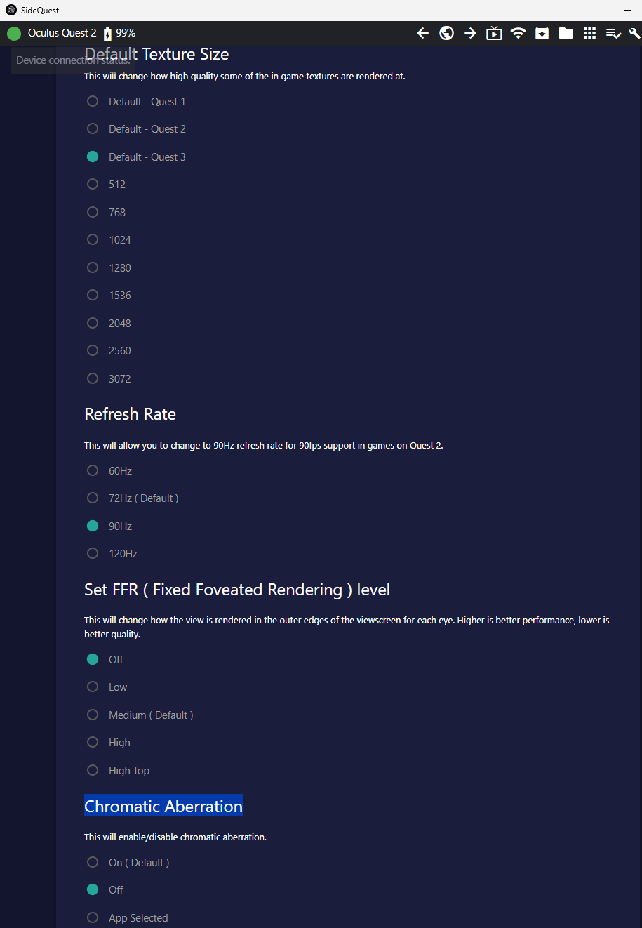 V mem pripade hlavne vyuzivam moznost nainstalovat pomoci sidequestvr Android aplikace .apk a hodne pouzivam HW moznost upresneni zobrazeni, jelikoz mam jen Quest 2 sidequestvr mi umoznuje tak nejak jak to napsat odemknout kvalitu textur pro Quest 3, nastavit Hz, dezaktivovat Chromatic Aberration ktere mi vylozene vadi a spoustu dalsiho takze ve finale za me velke +1 ;)